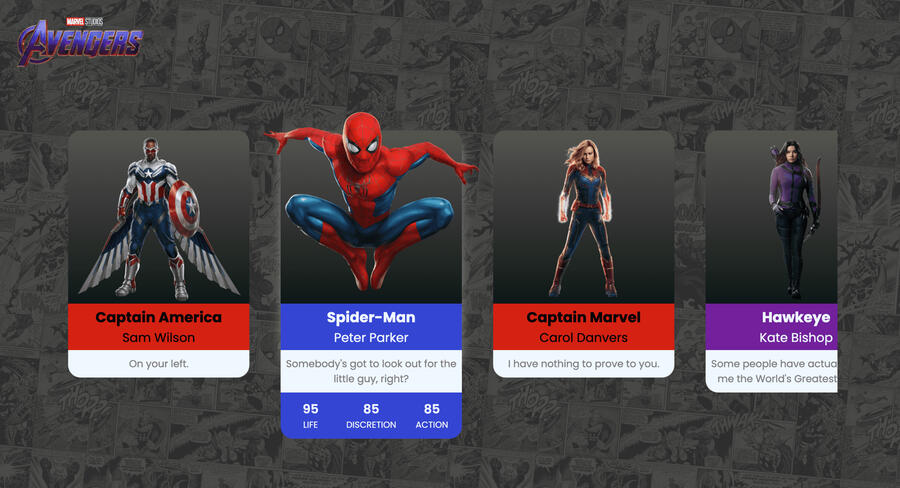 Site vitrine de cartes Marvel animées en Javascript avec récupération d'un fichier JSON. Responsive.